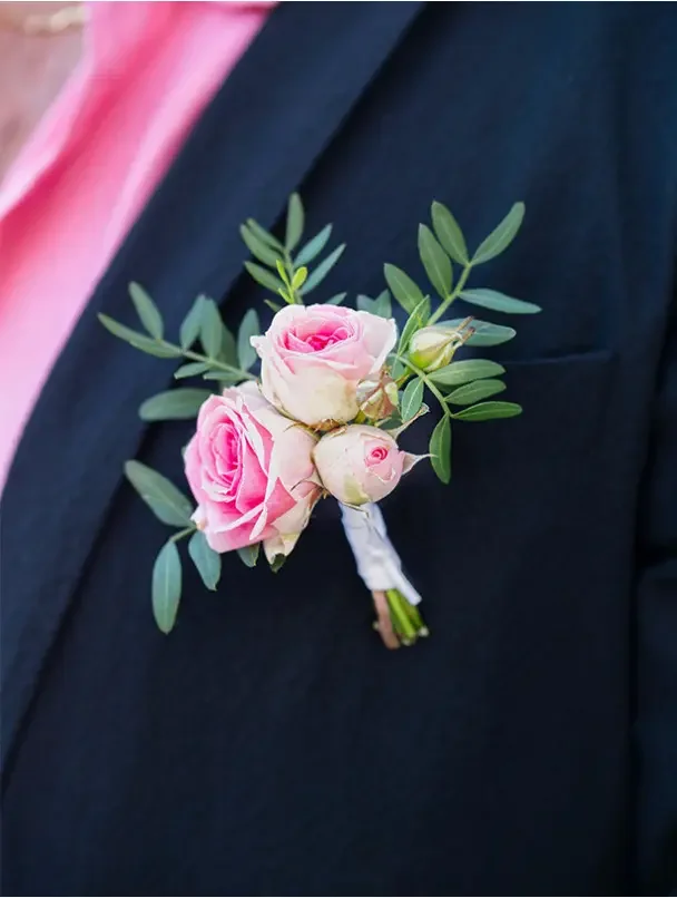 La boutonnière est un petit arrangement floral que le marié et ses proches portent à la veste le jour du mariage. Traditionnellement fixée sur le revers gauche de la veste, près du cœur, elle constitue un élément essentiel du code vestimentaire masculin pour cette occasion spéciale.