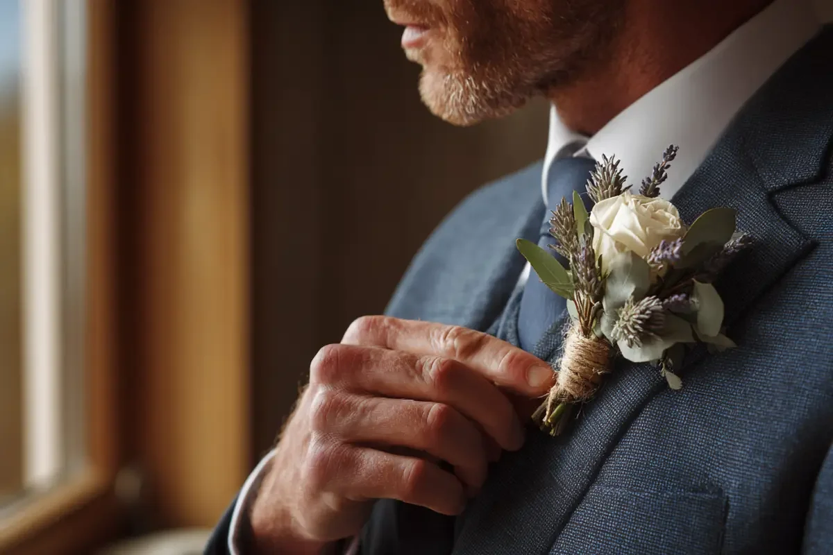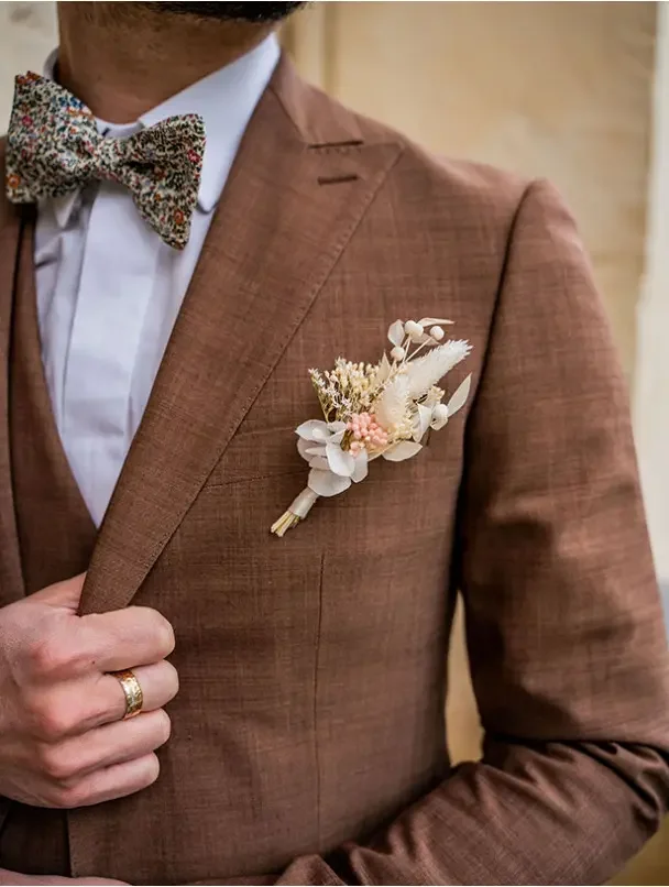 La personnalisation de la boutonnière permet d'exprimer la singularité du marié tout en maintenant une harmonie visuelle avec l'ensemble du mariage.