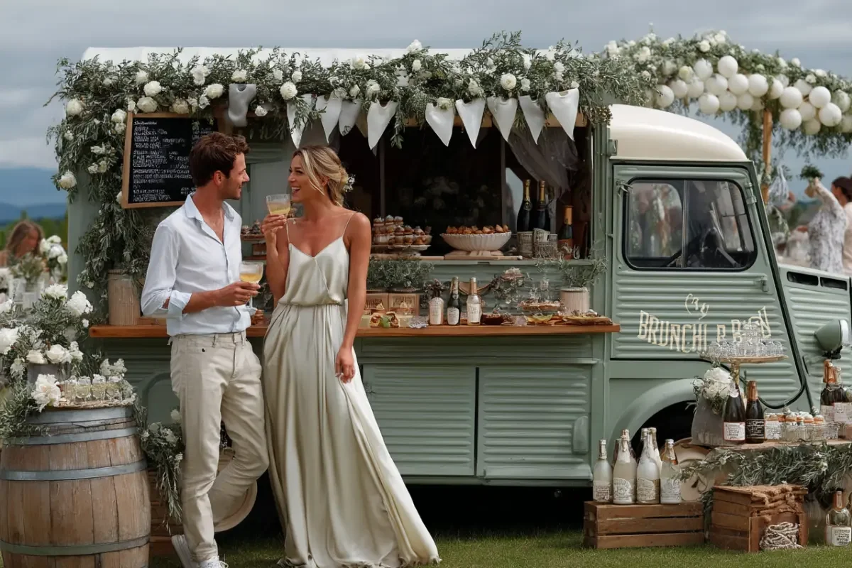 Pour un brunch vraiment original, les food trucks s'imposent comme la nouvelle tendance plébiscitée par les mariés. Qu'il s'agisse d'un camion à crêpes, à bagels ou proposant des spécialités internationales, cette option apporte une touche décontractée et festive à ton événement. L'avantage ? Une préparation sur place, des saveurs authentiques et une expérience visuelle qui ravira tes invités. 🚚✨