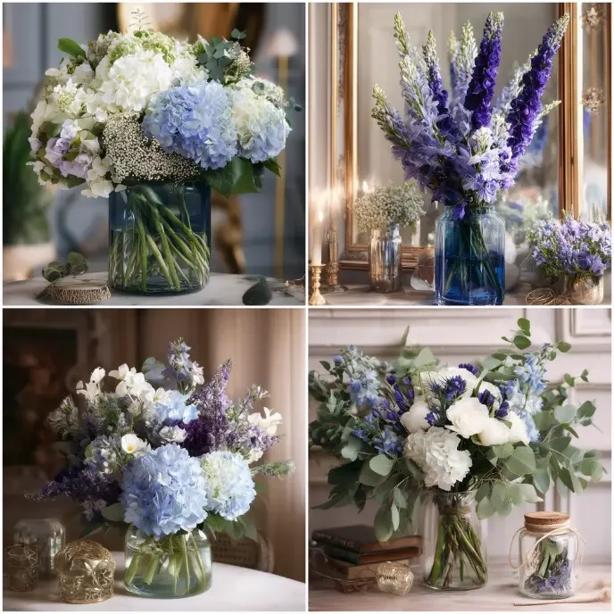 - Hortensias bleus ou blancs, parfaits pour leur volume et leur teinte