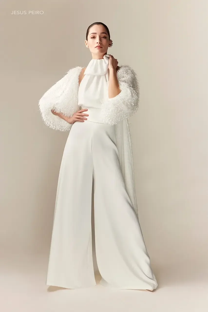 Les styles proposés lors des défilés cette année sont des pantalons fluides et larges, des combinaisons satinées, ou encore un ensemble deux pièces avec des détails en perles, apportant une touche chic et contemporaine aux tenues de mariée. Ils offrent également une gamme de couleurs, allant du blanc et de l'ivoire jusqu’aux tons blush et métalliques.