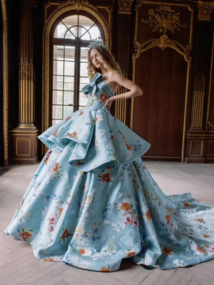 Les robes de mariée fleuries arborent des motifs, imprimés ou appliqués floraux et sont confectionnées dans des tissus comme l’organza, le taffetas ou le crêpe.